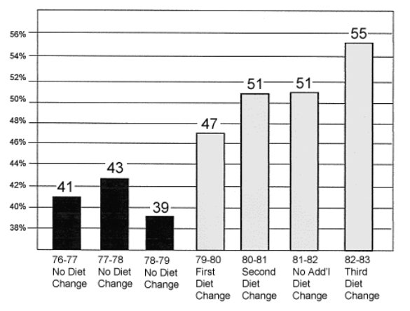 No changes were introduced in the first 3 years (black columns). In the school year 1979-80, the sugar content of foods was reduced, and two food colorings were omitted. In the next school year, i.e. 1980-81, the rest of the food colorings and preservatives were also sent into exile from the diet. In the subsequent academic year 1981-82, no modifications were made to the previously established diet, with no improvement in schools' performance at this time. In the academic year 1982-83, the additives E321 and E320, considered problematic by Feingold, were also eliminated. There was a rise in schools' performance in response to each modification, with an improvement in performance from the previous 41% on average to 55% (Schoenthaler et al., 1986).