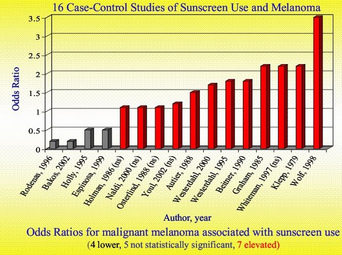 Johan Westerdahl et al. came to surprising results when they compared melanoma patients living in south Sweden to controls. They found that of individuals under the age of 50, those who used sunscreen consistently had more than 3 times the risk of developing melanoma on the trunk as compared to those who never used it 15. According to the summary of an international conference on the cancer-preventing effect of sunscreens held in 2000 in Lyon, France, 8 out of the 15 reviewed studies found that the use of sunscreens can increase the risk of melanoma as much as 2.6-fold, 4 of the studies found no effect of sunscreens on melanoma incidence, and 3 found sunscreens protective against melanoma 16. (Below is another summary from vitamindwiki.com.)