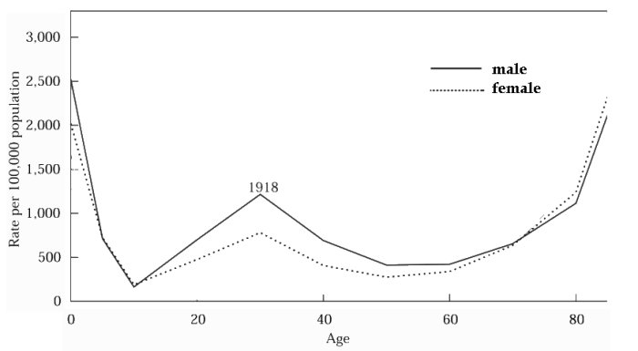 For a male, all the things that are an advantage in courting (height, masculine face and physique, bodily strength, social dominance, pushiness, etcetera) are the effect of testosterone. Testosterone levels are the highest in the 20-40 age range, so men most easily fall victim to infections during this time. The graph below shows the mortality curves for male and female Spanish flu in 1918.