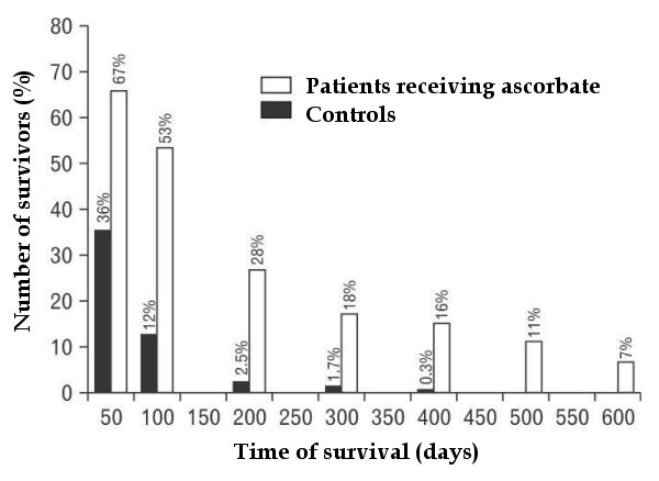 As vitamins were discovered, one after another, and it turned out that their absence causes serious disruption to the body, many doctors and researchers began to consider vitamin deficiency as the cause of disease. In Helmut Böttcher's "Book of Vitamins", published in 1965, you can read a lot about this (Böttcher, 1965). Doctor William J. McCormick discovered in the late 1940s that cancer patients had very low levels of vitamin C, and because vitamin C is essential for collagen synthesis (an important component of connective tissue), he concluded that cancer would not be able to spread if the body, in the presence of sufficient vitamin C, could seal the incipient tumor into an impenetrable connective tissue envelope (Saul, 2003). McCormick explains other diseases, including cardiovascular diseases, as being a result of vitamin C deficiency. Since the 1940s, there have been numerous reports of higher doses of vitamin C improving the condition of cancer patients, and a much quoted case by Edward Greer who cured a man with leukemia using 35-44 grams of vitamin C daily (Cameron and Pauling, 1979). Scottish surgeon Ewan Cameron also sees the cause of cancer growth and metastasis as "tissue envelope" weakening. Cameron treated cancer patients and observed that cancer cells produce two enzymes that weaken proteins that hold together normal tissues, including collagen (Cameron and Pauling, 1979). An enthusiast for vitamin C, Linus Pauling, called Cameron's attention to the fact that vitamin C stimulates collagen synthesis, and as a result, Cameron began experimenting with 10 grams of vitamin C a day for his cancer patients. According to their 1974 report, 90% of the 50 patients with cancer resistant to all other treatments had 3 months left to live, yet, with 10 grams of vitamin C a day, "only" 50% of them died within 100 days, with 20 having an average survival time of 261 days. Five patients were still alive at the time of publication of the results, representing an average survival of 659 days (Cameron and Campbell, 1974). Cameron and Pauling, excited by the results, wanted a true placebo-controlled double-blind trial (where neither patient nor investigator knew who received the placebo and who received vitamin C). However, despite the first convincing results presented, neither the US National Cancer Institute nor the American Cancer Society supported the study, claiming that animal testing was needed first. When Pauling asked for support, it was only granted on his umpteenth application. For Pauling, this was the first sign that oncology wanted to block research into alternative treatments. The reasons are understandable: Cameron's results were far superior to chemotherapeutic agents, and vitamin C was harmless and did not cause suffering to patients. In the end, a controlled study was conducted with Cameron's 100 already incurable patients. Cameron's patients were given vitamin C, and 1,000 end-stage patients treated in other departments of the hospital received only the palliative treatment that Cameron's patients received, in addition to vitamin C (Cameron and Pauling, 1976). Their results were remarkable. At day 100 of the study, 12% of the control group and 53% of the vitamin C group were still alive. At day 300, 1.7% of controls and 18% of those receiving vitamin C were still alive, at day 400, 0.3% of the controls and 16% of the vitamin C group were still alive, and at day 600, 7% of the vitamin C group was still alive. Overall, patients receiving vitamin C had a mean survival time 6.6 times of the control group. By the way, members of the vitamin C group lived an average of 300 days longer, and it is also not unimportant that this was with a much better quality of life. Another study that overlaps with the previous one also reaffirmed the life-enhancing effect of vitamin C therapy (Cameron and Pauling, 1978). This study added to the previous one that in 9 types of cancers (including colon, breast, and ovarian cancers), it was demonstrated separately, albeit to varying degrees, the life-enhancing effects of vitamin C.